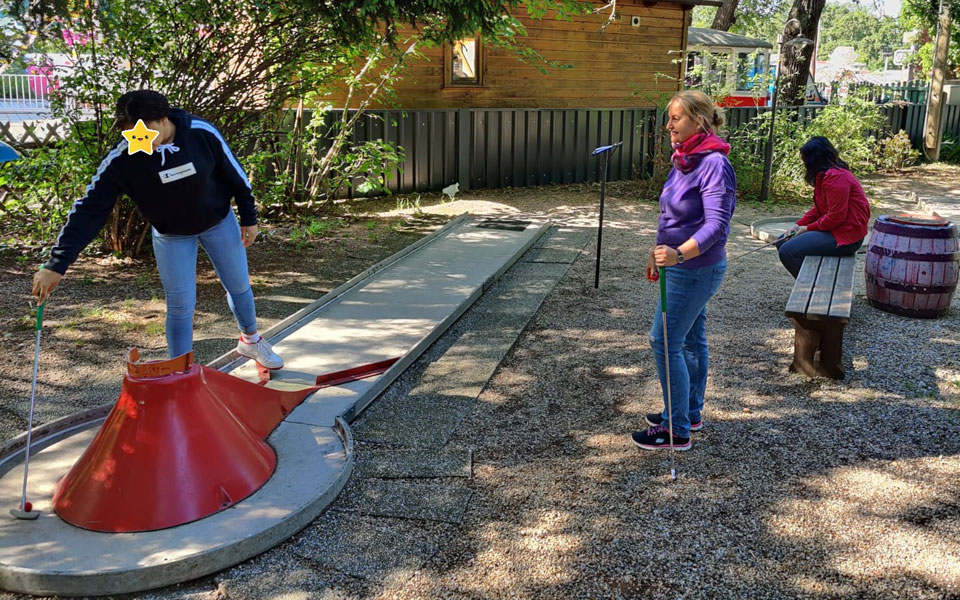 Sieben Mädchen/junge Frauen und zwei Betreuer*innen machten sich im Rahmen des Möglichen gemeinsam auf den Weg, die Restriktionen und Einschränkungen von COVID-19 möglichst für eine kurze Zeit hinter sich zu lassen. Mit Masken und Desinfektionsmittel ausgerüstet verbrachten wir knappe zwei Stunden gemeinsam beim Minigolf im Böhmischen Prater.
