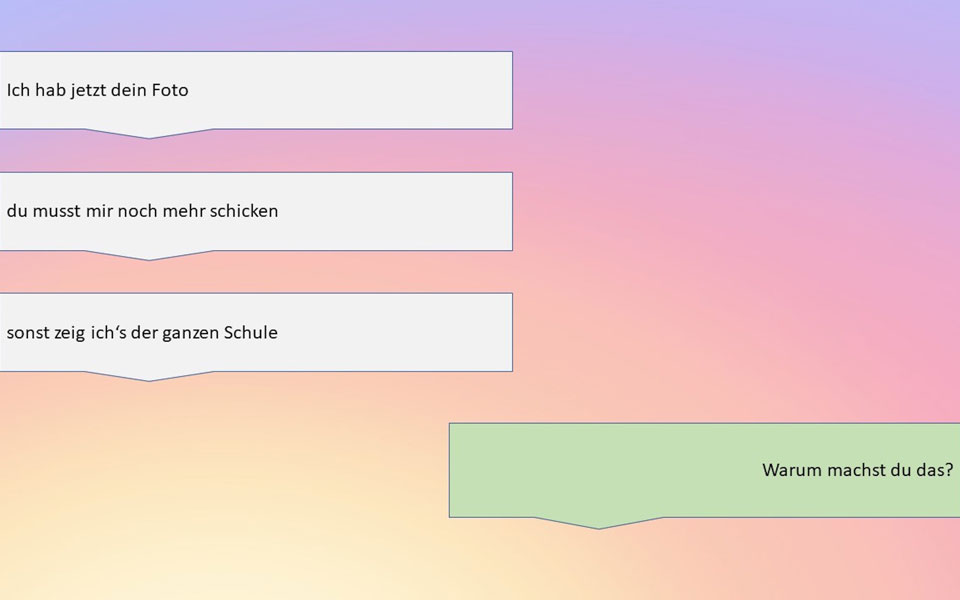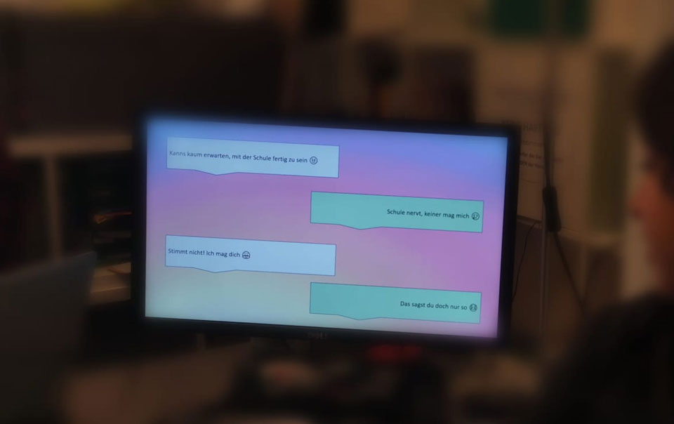 Im Rahmen der Aktion wurden der den teilnehmenden Jugendlichen Nachricht für Nachricht auf den PC-Bildschirm ein Chatverlauf vorgeführt, in dem sie sich in eine betroffene Person hineinversetzen sollten. Schrittweise entwickelt sich zwischen den imaginären Chatpartner*innen ein Gespräch das bald Zeichen von Cyber-grooming und Sextortion zeigt. Bei jeder neuen Nachricht wurde den Jugendlichen die Frage gestellt, ob für sie nun eine Grenze erreicht wäre, bei dem sie aus dem Gespräch aussteigen würden, und wie sie das im Falle schaffen würden.