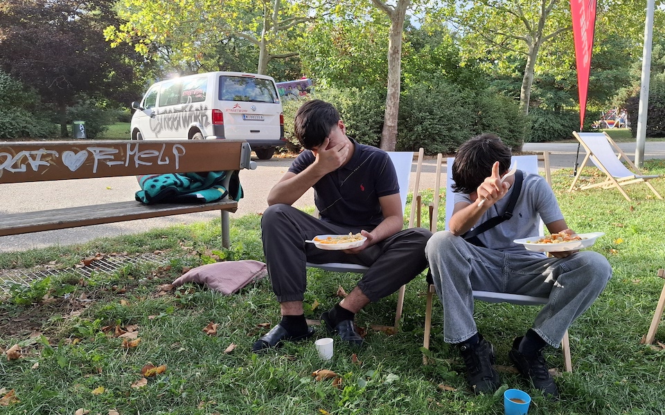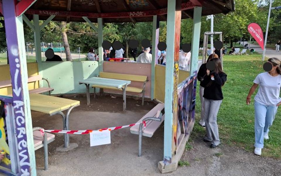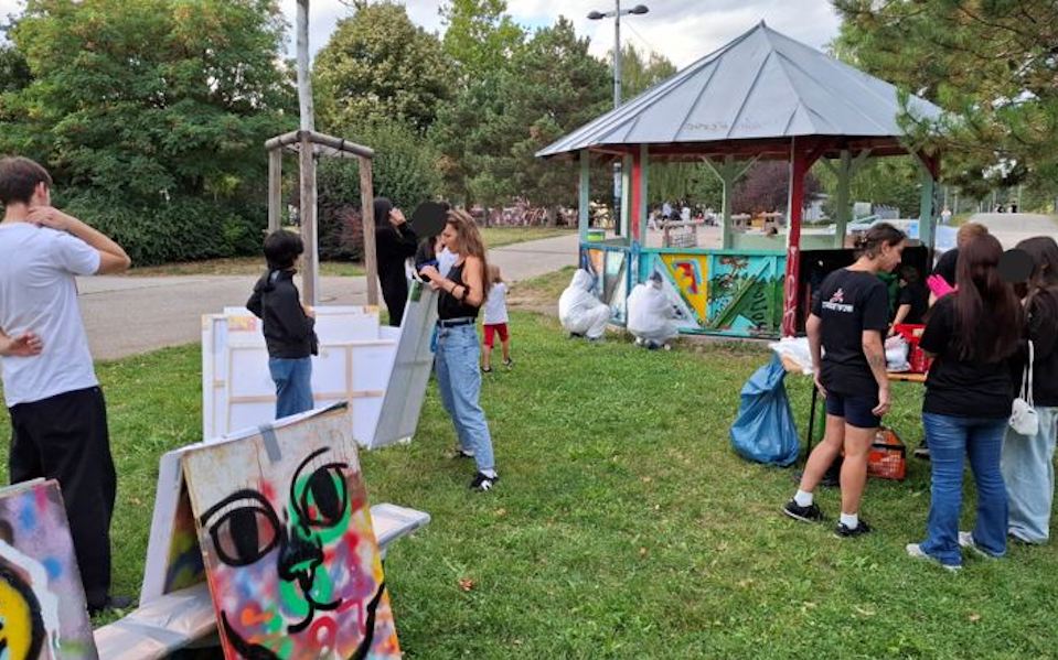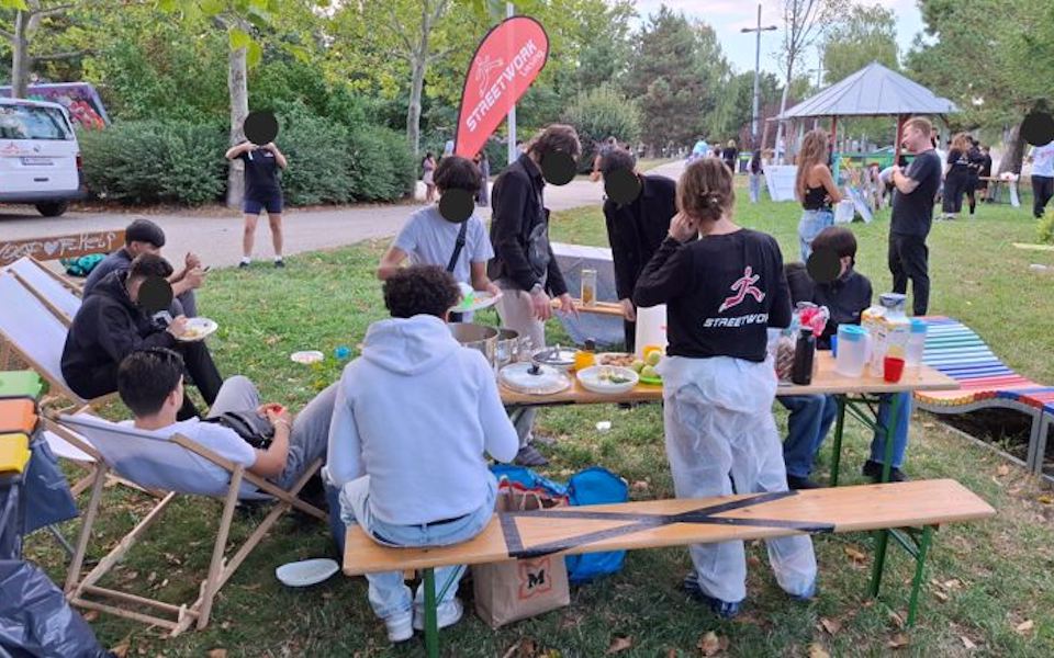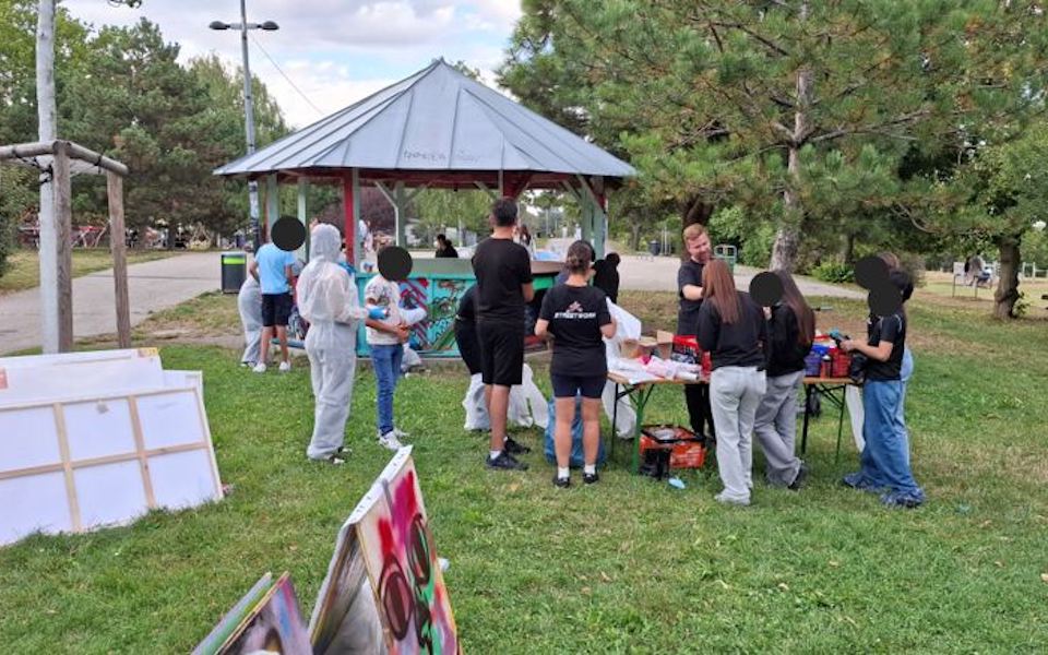 Der Park im 23. Bezirk ist ein beliebter Treffpunkt für alle Generationen – gerade in den letzten Sommertagen bot er die ideale Kulisse für dieses kreative Projekt. Das Team von Streetwork Liesing organisierte ein Fest, das neben gesunder Jause mit viel Gemüse, Nudelsalat und Getränken auch jede Menge Raum für Kreativität bot. Im Mittelpunkt stand die künstlerische Neugestaltung des Pavillons mittels Graffiti sprayen und somit die aktive Beteiligung der Jugendlichen an der Gestaltung des öffentlichen Raumes. Bevor es an die Wände ging, konnten die Jugendlichen zunächst auf Übungsplatten den Umgang mit Spraydosen erlernen, anschließend durften sie ihre Ideen direkt am Pavillon umsetzen. Unterstützt wurden sie dabei von einem professionellen Graffiti-Künstler, der nicht nur kreative Impulse lieferte, sondern auch technische Grundlagen, rechtliche Rahmenbedingungen und Sicherheitsaspekte des Sprayens erklärte. Entsprechende Schutzkleidung und Materialien wurden selbstverständlich für alle Teilnehmenden zur Verfügung gestellt.